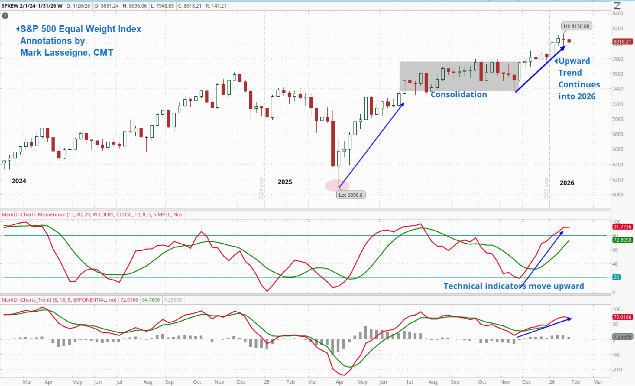 After building on the positive momentum from late 2025, the market kicked off the new year with a steady advance in January. Market consolidations are not a bad thing; they often recharge the engines before the next leg up. Think of it like a brief winter nap after the holiday feast, where the body rests and then wakes up ready for more action. This weekly chart of the S&P 500 equally weighted index paints a clear picture. We saw the upward trend from December continue into January, with broader participation helping the equal-weighted version outperform the cap-weighted benchmark. The white and red bars on the chart below show the weekly ups (white bars) and downs (red bars), highlighting a solid month of gains without major pullbacks. The consolidation phase from mid-2025 has given way to renewed strength, and technical indicators remain supportive. No one really knows what the rest of 2026 holds, but January's positive close, coupled with historical patterns like the January barometer, is an encouraging sign.