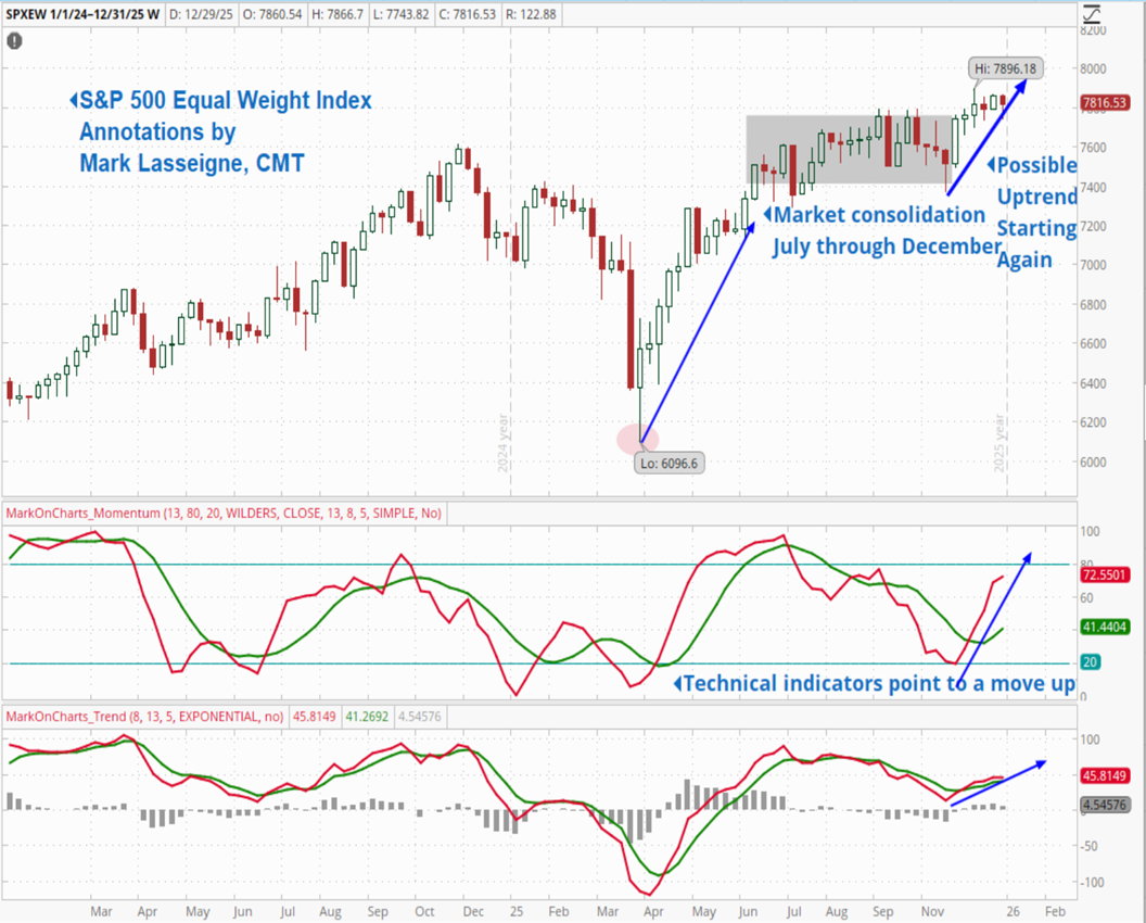 After several months of consolidation, it appears that the market is attempting to make the next move. Market consolidations are not a bad thing. Think of it being a Thanksgiving dinner where everyone ate a bit too much turkey and then sat on the couch for the remainder of the afternoon doing very little. And then, everyone gets up and returns to normal activities. This chart of the S&P 500 equally weighted index shows a similar picture. We had a sideways market for much of the second part of 2025, and then in the last few weeks of 2025 the market started trending upward again. The white and red bars on the chard below show the ups (white bars) and downs (red bars) of each week. The consolidation area (market with the gray rectangle) shows the sideways action of the market from roughly July to November. Then, a possible trend began to emerge again in December. Technical indicators have begun turning up. No one really knows what 2026 holds, but the December movement is a positive sign.