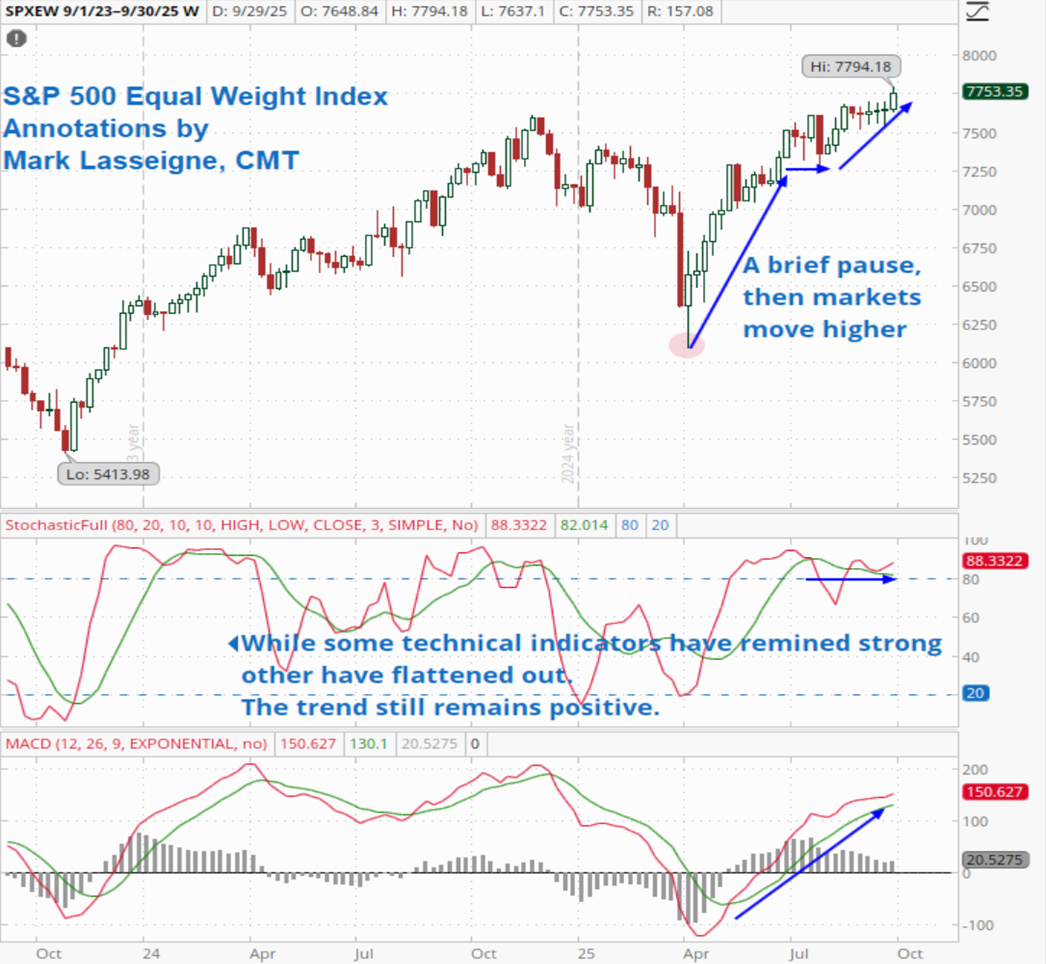 The trend continues to upward. Last month, it began to flatten out. But that did not last long. There will always be ups and downs in the market. My job is to manage risks while capturing as much of the gains as possible. While technical analysis is not perfect, it’s important to have both a buy strategy and a sell strategy. And this is done with rules that have been back tested over previous market cycles. Perfect, no. Prudent, yes. As a Chartered Market Technician, I employ a disciplined, multi-stage technical strategy to systematically reduce equity exposure during early warning signs of market downturns while progressively re-entering on confirmed bullish reversals to capture recoveries and optimize long-term portfolio performance. It’s one of the things that makes us different from other financial firms.